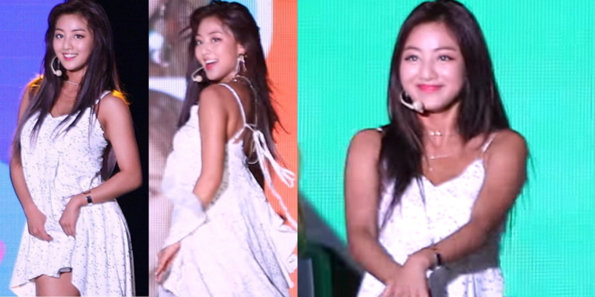지난 7월 울산 썸머 페스티벌에 참여했던 지효는 하얀색 끈 원피스와 대조되는 어두운 피부를 자랑했다.