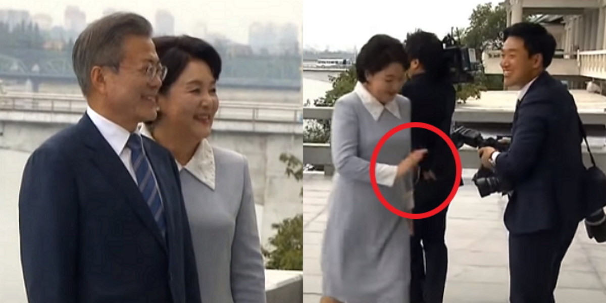 '사랑꾼'으로 잘 알려진 문 대통령은 김 여사에게 사진을 함께 찍자고 했고, 김 여사는 옆으로 슬금슬금 다가가 함께 사진을 찍었다.