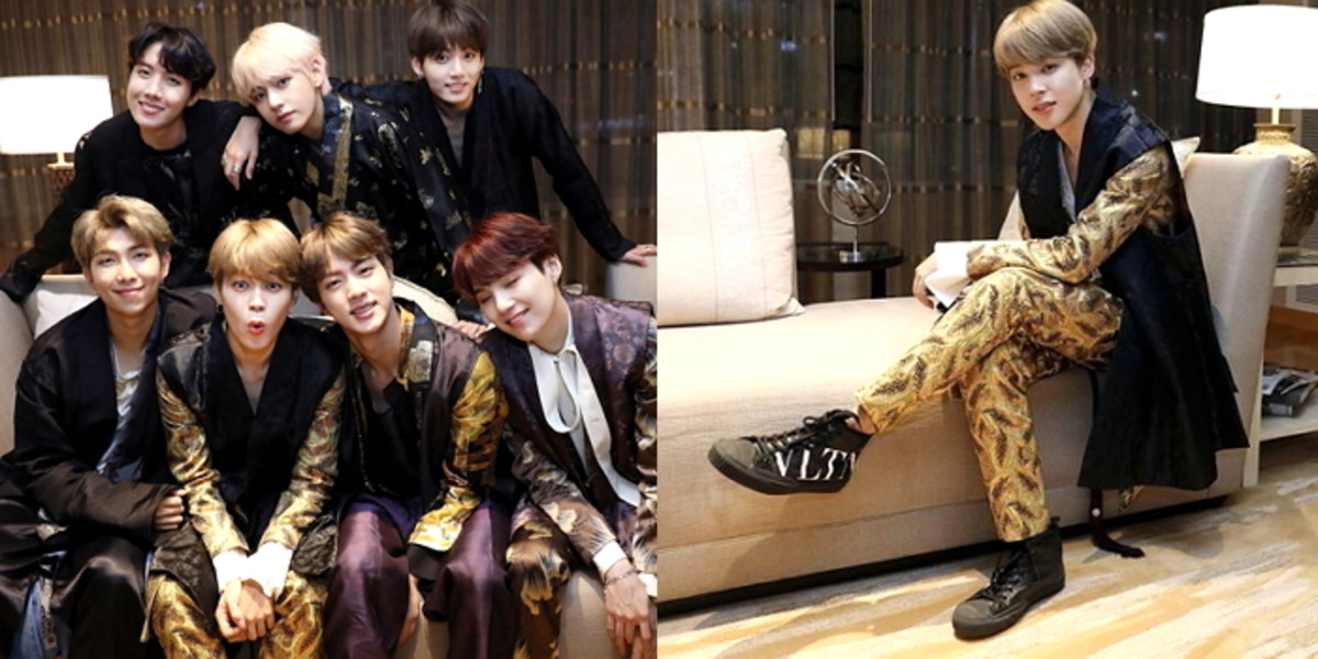 공개된 사진 속 방탄소년단은 멋진 개량 한복을 입고 포즈를 취하고 있다.