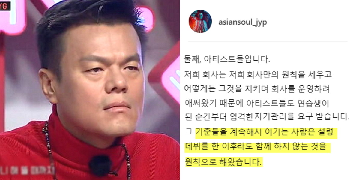 해당 글에서 박진영은 "저희 회사는 저희 회사만의 원칙을 세우고 어떻게든 그것을 지키며 회사를 운영하려 애써왔기 때문에 아티스트들도 연습생이 된 순간부터 엄격한 자기관리를 요구받는다"며 자신이 세운 아티스트 운영 원칙을 강조했다.