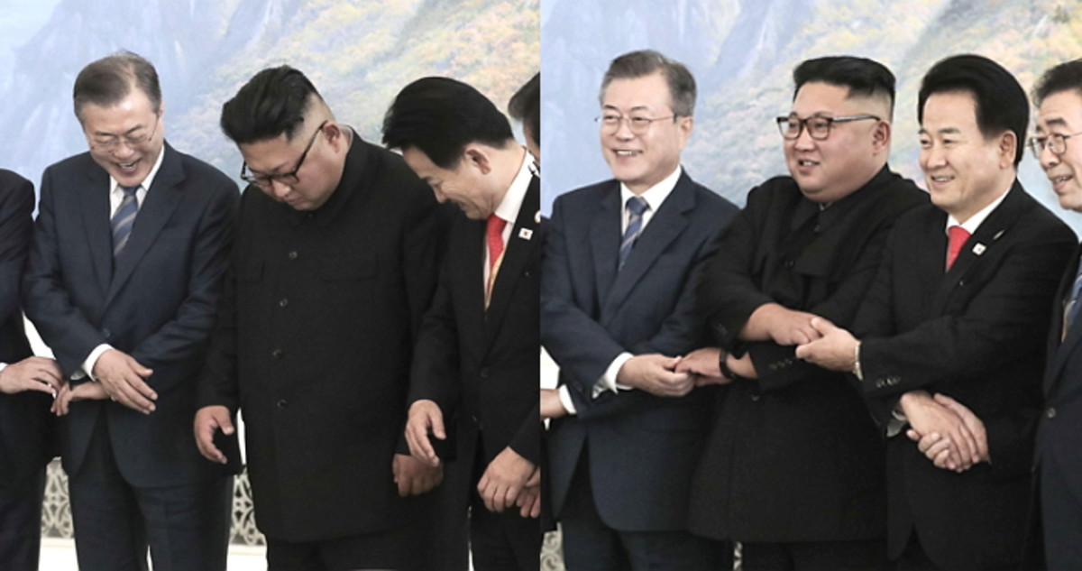 이날 나란히 선 남한 수행원들은 팔을 엇갈아 서로의 손을 잡는 자세를 제안했다.