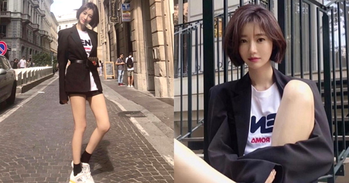 사진 속 그는 짧은 핫팬츠에 품이 큰 재킷을 입고 늘씬함을 뽐내고 있다.