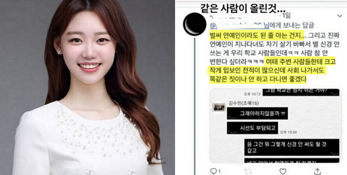 친구는 "벌써 연예인이라 된 줄 아는 건지…그리고 진짜 연예인이 지나다녀도 자기 살기 바빠서 별 신경 안 쓰는 게 우리 학교 사람들인데. 사람 참 안 변한다 싶더라. 여태 주변 사람들한테 크고 작게 밉보인 전적이 많으신데 사회 나가서도 똑같은 짓이나 안 하고 다니면 좋겠다"라며 김수민 아나운서와 대화를 나눌 때와는 다소 다른 태도의 글을 게재했다.