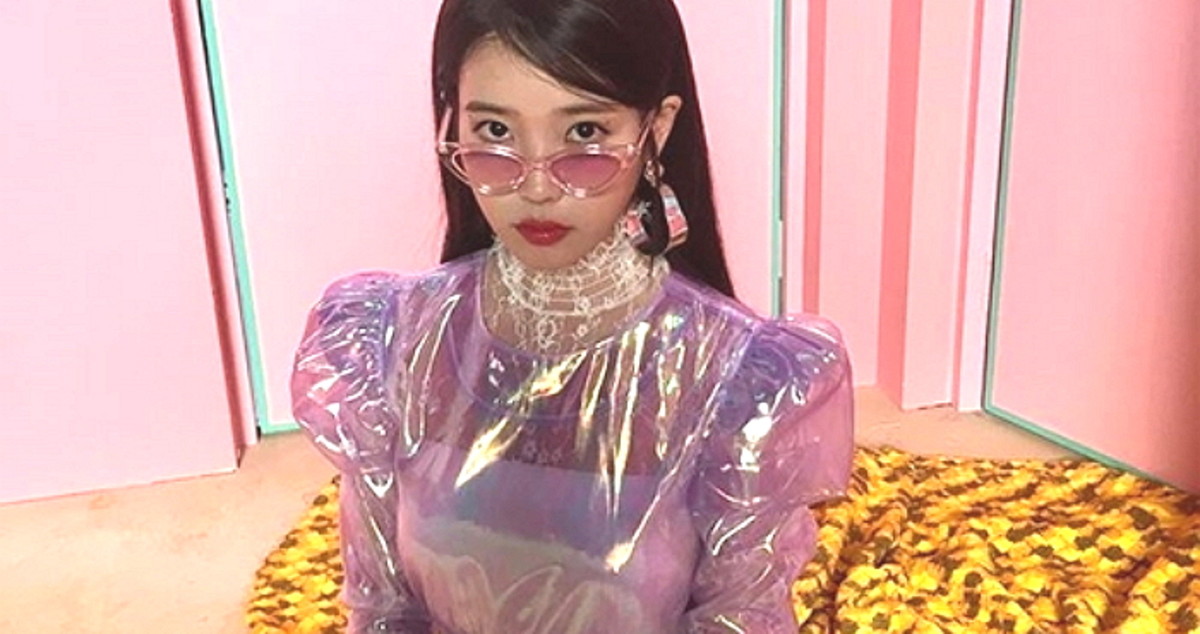 공개된 사진 속엔 보라색 안경을 쓰고 화려한 보라색 블라우스를 입은 아이유가 세트장으로 추정되는 곳에 앉아 카메라를 응시하는 모습이 담겼다.