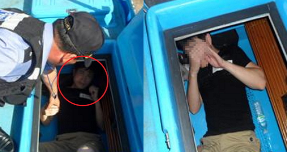 단속반이 활어차 물칸을 열자 안에 들어있던 중국인 장모(48) 씨가 얼굴을 가렸다.
