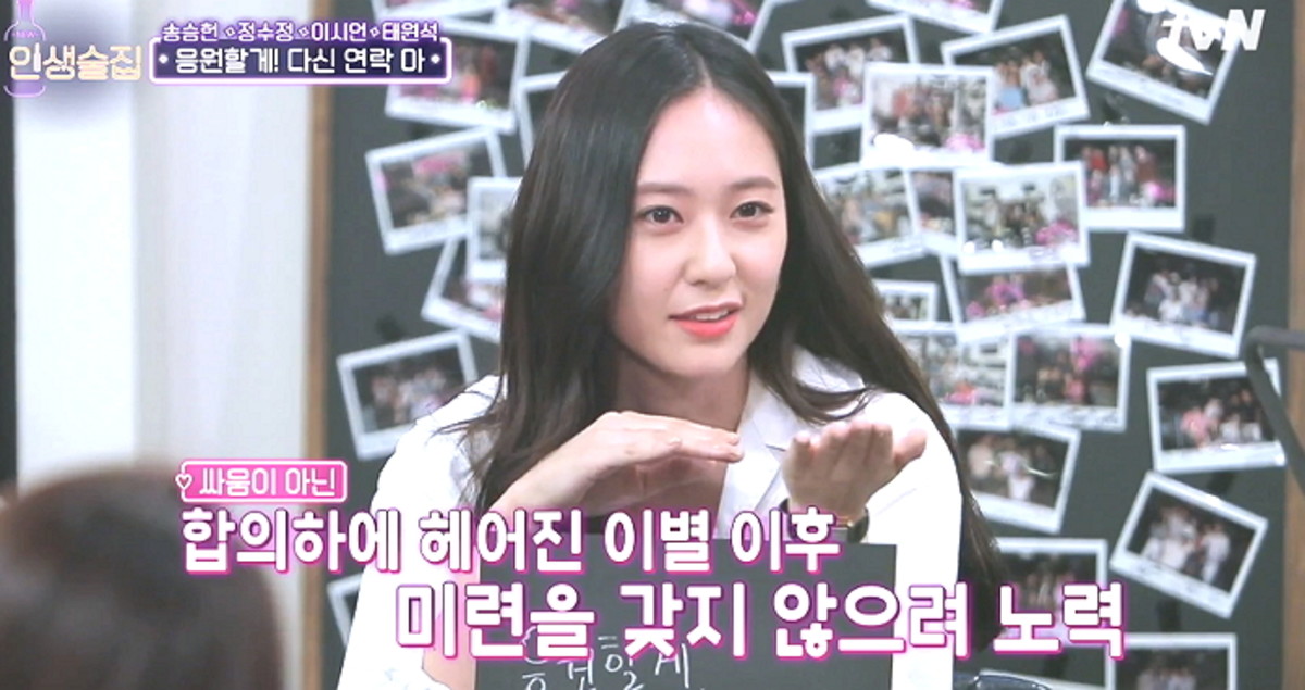 정수정은 "서로 합의하고 헤어졌으면 진짜 헤어지는 것이다. 미련을 안 가진다"라고 설명했다.