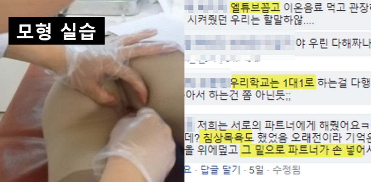 댓글에는 관장뿐 아니라 고무튜브를 코에서 위까지 연결하는 엘튜브(L-tube), 침상 목욕 등에도 학생들이 실습에 동원됐다는 이야기도 있었다.