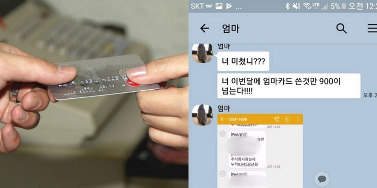 그의 엄마는 카톡 메시지에서 A씨에게 "너 미쳤냐"며 "이번 달에 엄마 카드 쓴 것만 900이 넘는다"고 지적했다.