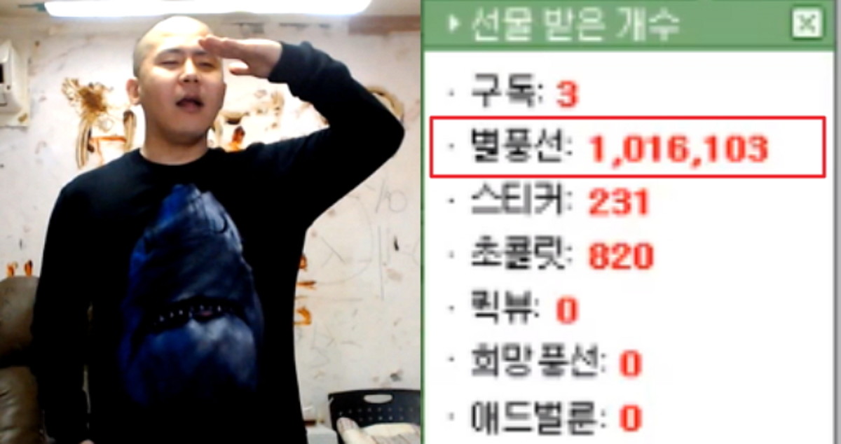 별풍선 100만 개는 약 1억원의 값어치를 지닌다. 시간당 약 2,000만원의 수익을 올린 셈이다.