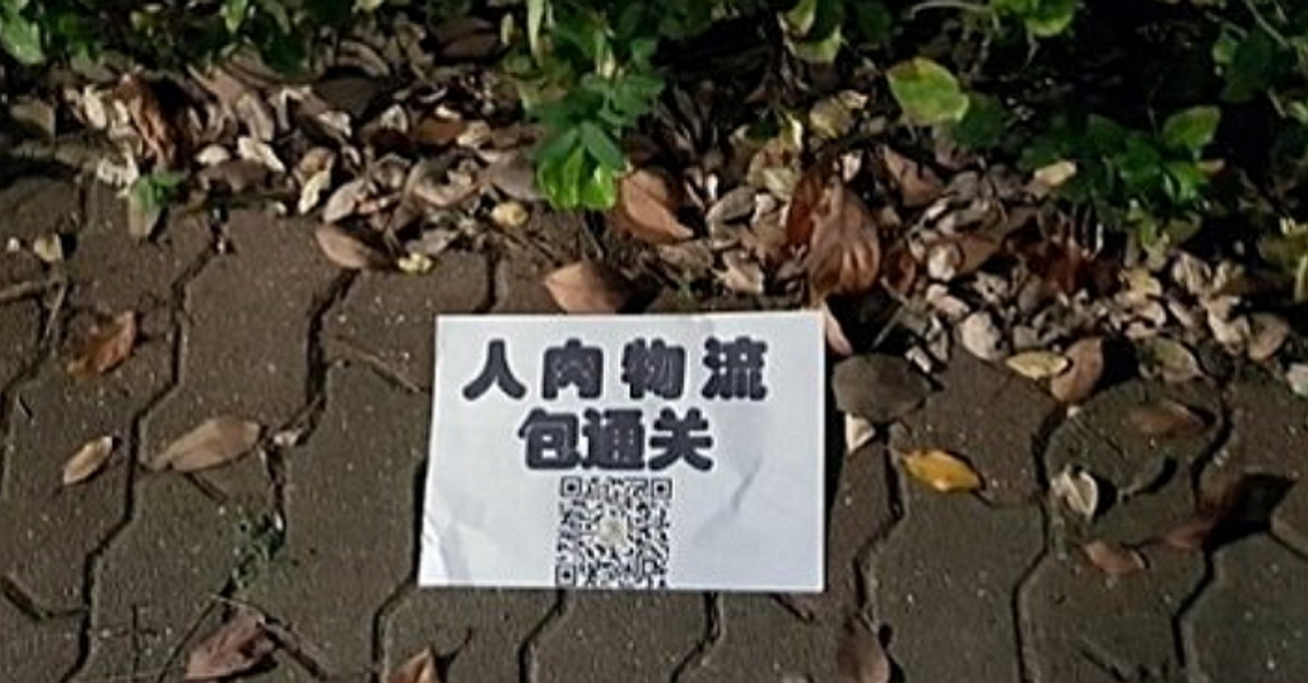 지난달 25일 제주 경찰은 제주국제공항에서 해태동산 방면으로 향하던 한 남성이 '人肉物流 包通关'라고 적힌 전단지를 발견해 수사에 나섰다고 밝혔다.