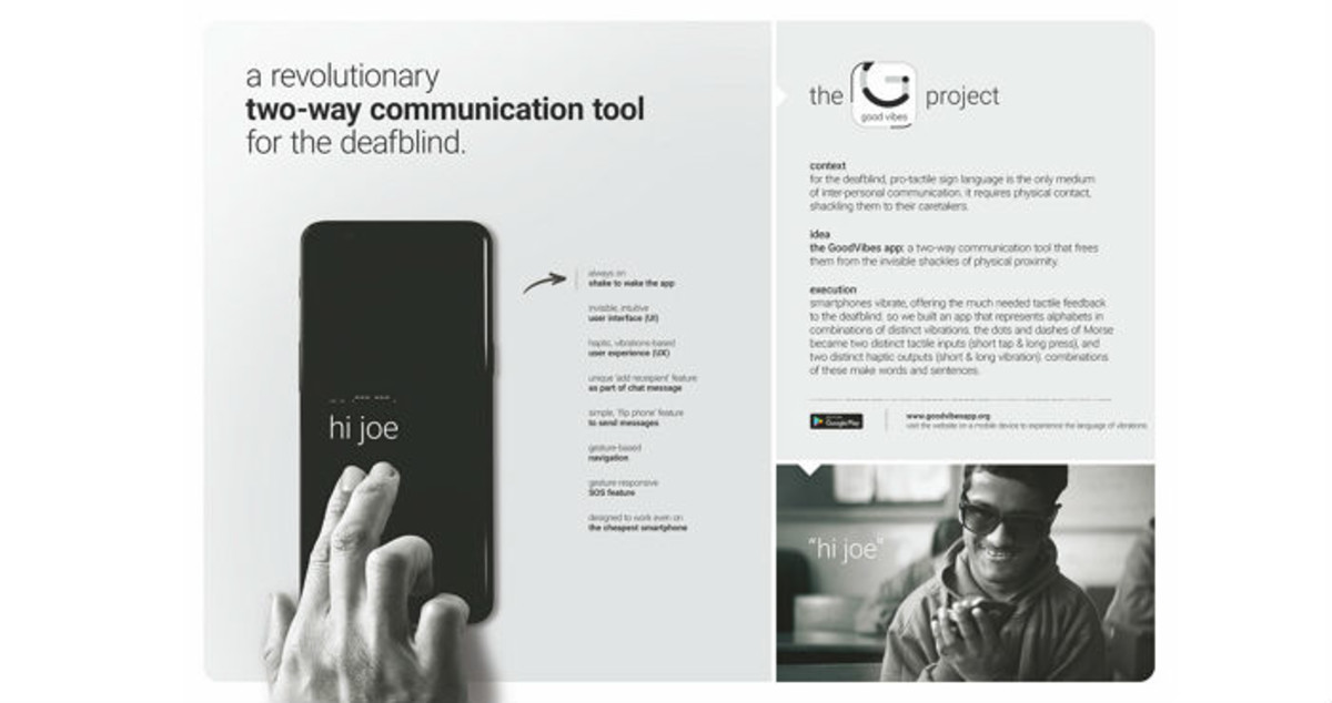 제일기획 인도법인이 공익단체 센스 인터내셔널과 협업해 만든 굿 바이브 앱은 모스 부호와 스마트폰의 햅틱(촉각) 기능을 활용해 간단한 터치만으로 의사소통이 가능하도록 한 혁신적인 아이디어다.