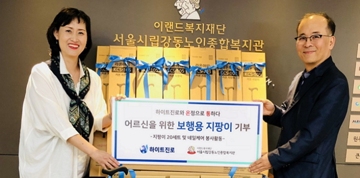 어르신들에게 '보행용 지팡이 기부'한 하이트진로