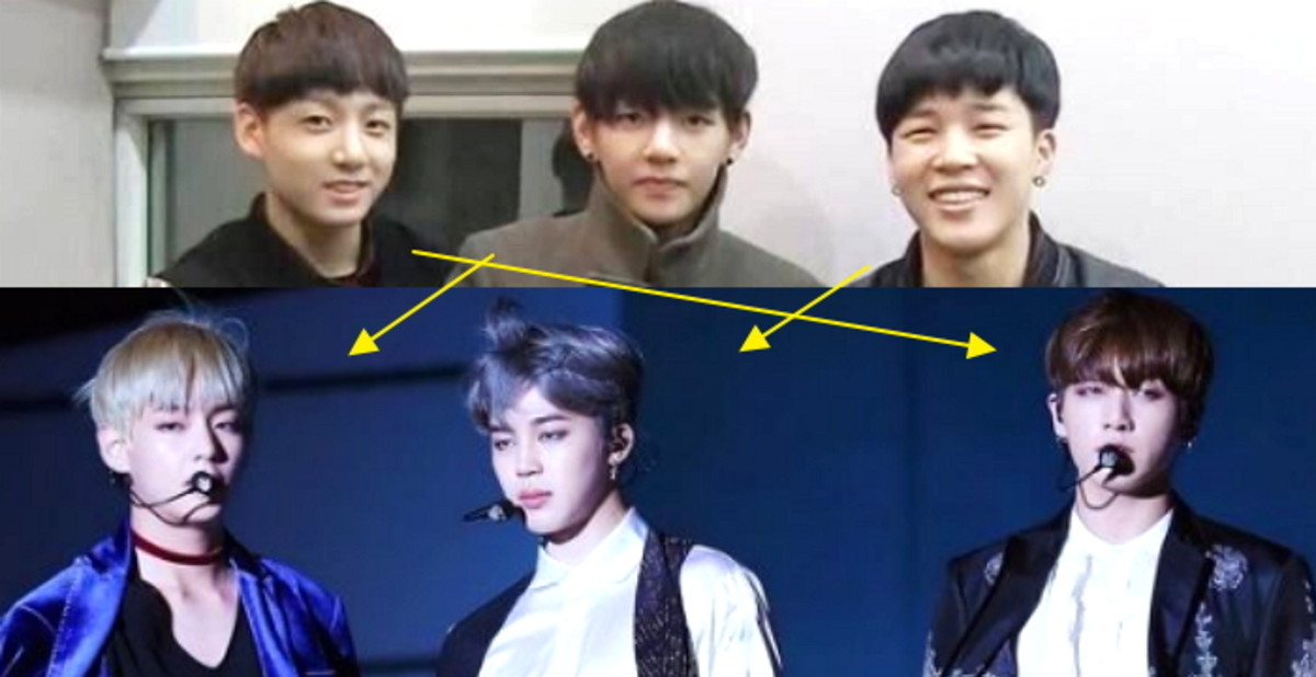 사진 속에는 방탄소년단 데뷔 초창기 시절 정국, 뷔, 지민의 모습이 보인다.