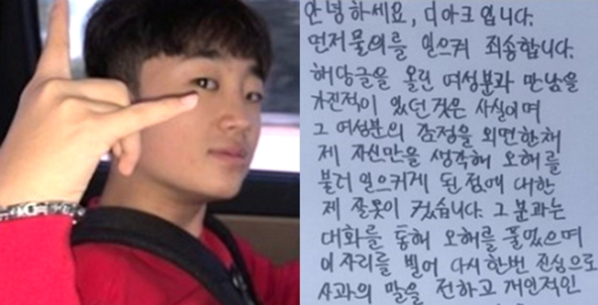 6일 디아크는 자신의 SNS에 자필로 쓴 편지 형식의 사과문을 올렸다.