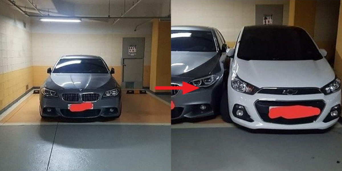 BMW차량의 좌우로는 한눈에 봐도 차가 들어가기엔 좁은 공간만이 남겨져 있다.