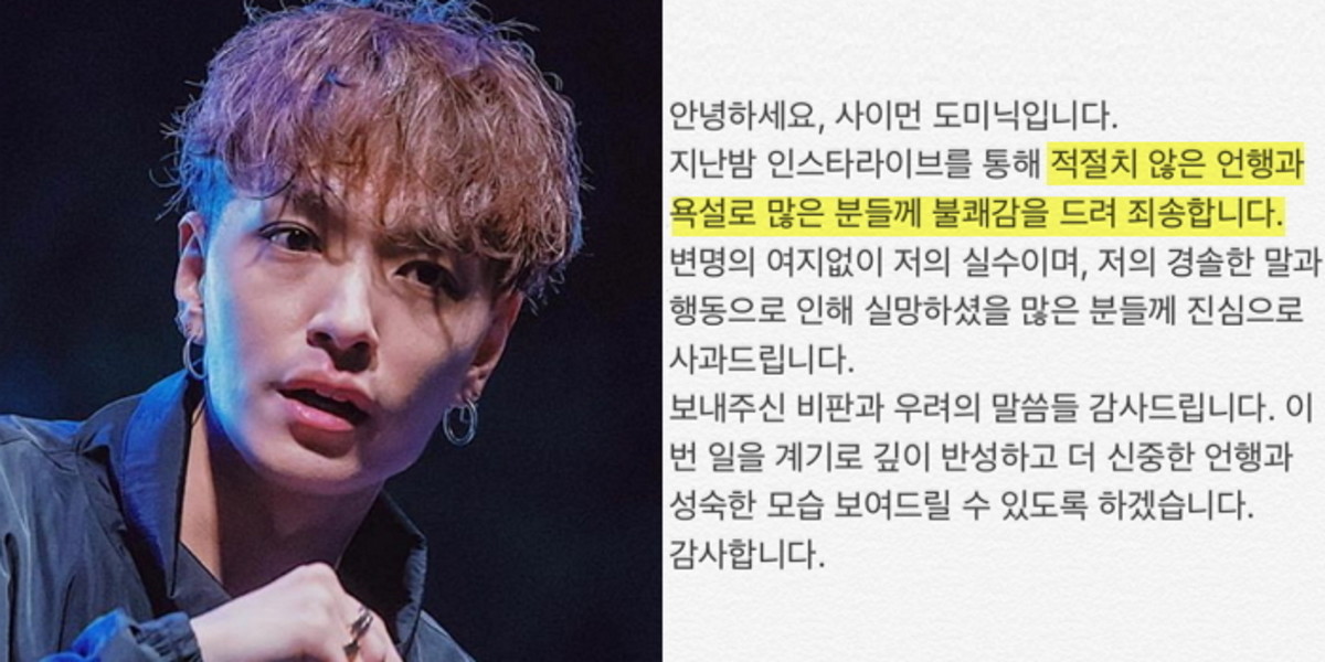 그는 "안녕하세요, 사이먼 도미닉입니다. 지난밤 인스타 라이브를 통해 적절치 않은 언행과 욕설로 많은 분들께 불쾌감을 드려 죄송합니다"라고 사과했다.