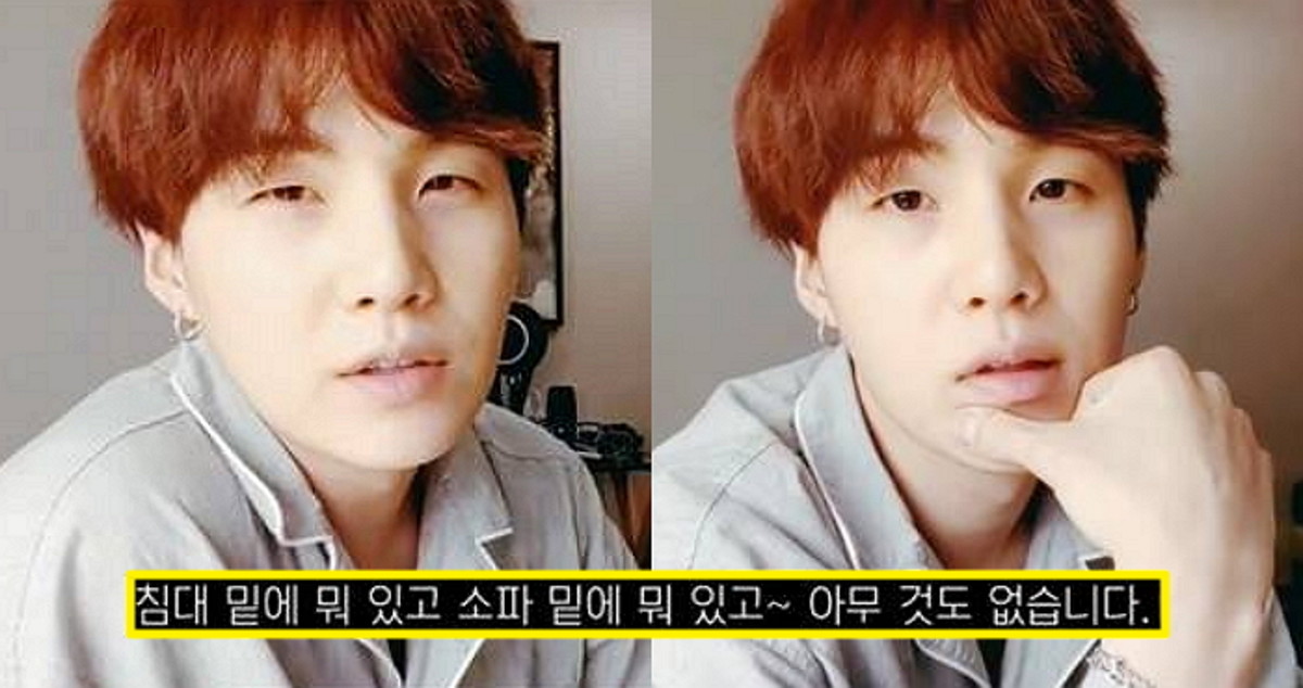 슈가는 "침대 밑에 뭐 있고, 소파 밑에 뭐 있고… 이런 거 아무것도 없다. 걱정하지 마라"고 시크하게 말했다.