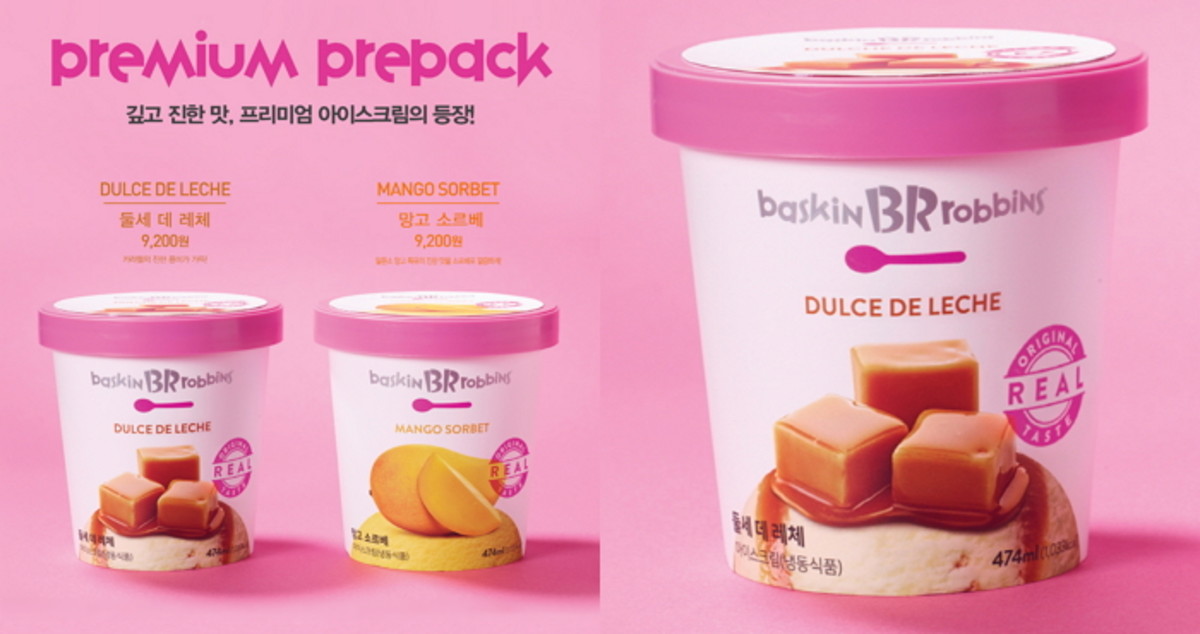 배스킨라빈스가 새롭게 출시한 프리미엄 프리팩은 '둘세 데 레체(dulce de leche)'와 '망고 소르베' 2종으로 구성됐다.