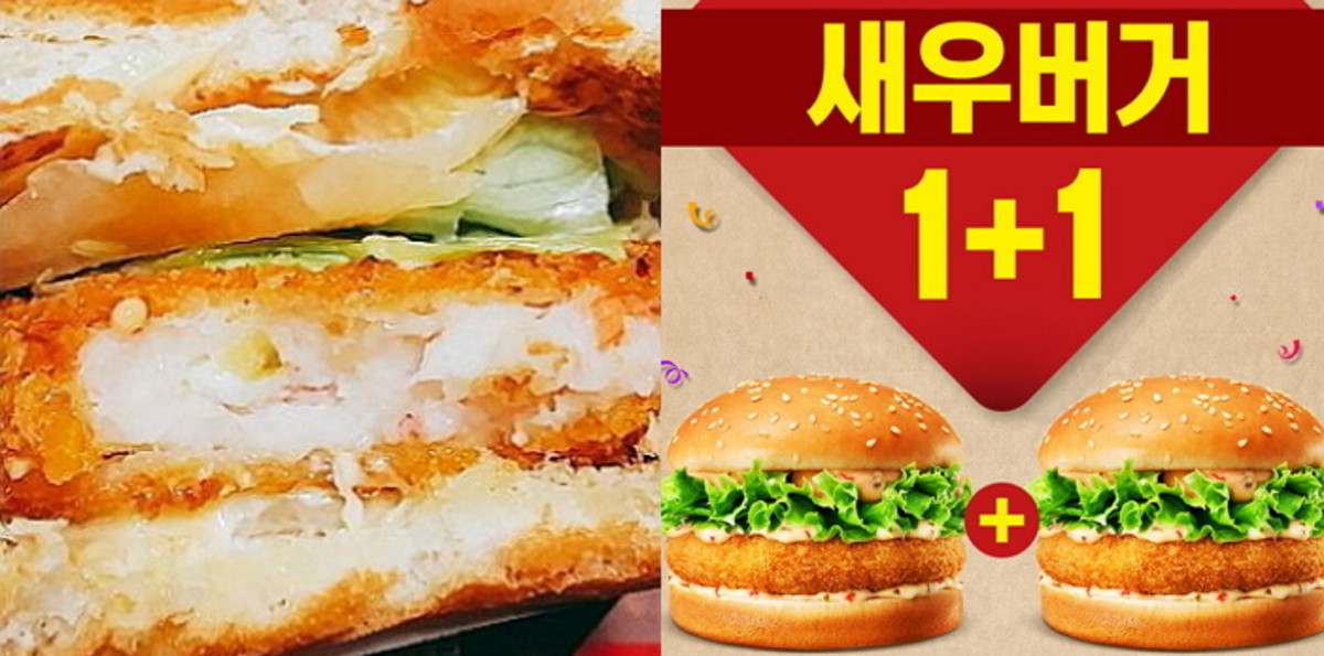 행사 제품은 새우버거이며, 단품 1개(3600원)를 사면 1개를 덤으로 받을 수 있다.