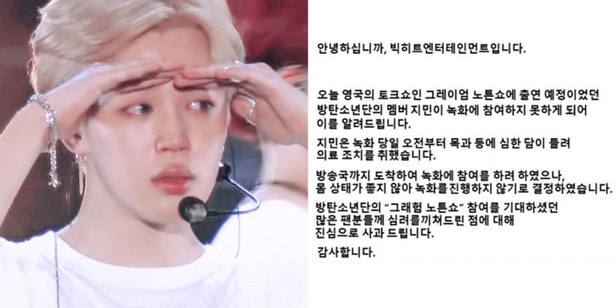 12일 빅히트엔터테인먼트 측은 공식 트위터를 통해 "오늘 영국 토크 쇼인 그레이엄 노튼 쇼에 참여할 예정이었던 멤버 지민이 녹화에 참여하지 못하게 돼 이를 알려드린다"고 공지했다.