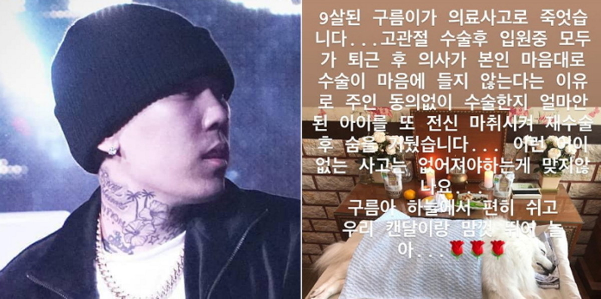 12일 새벽 도끼는 자신의 인스타그램 스토리를 통해 반려견 '구름이'가 숨을 거뒀다고 알리며 의료 사고를 당했음을 폭로했다.