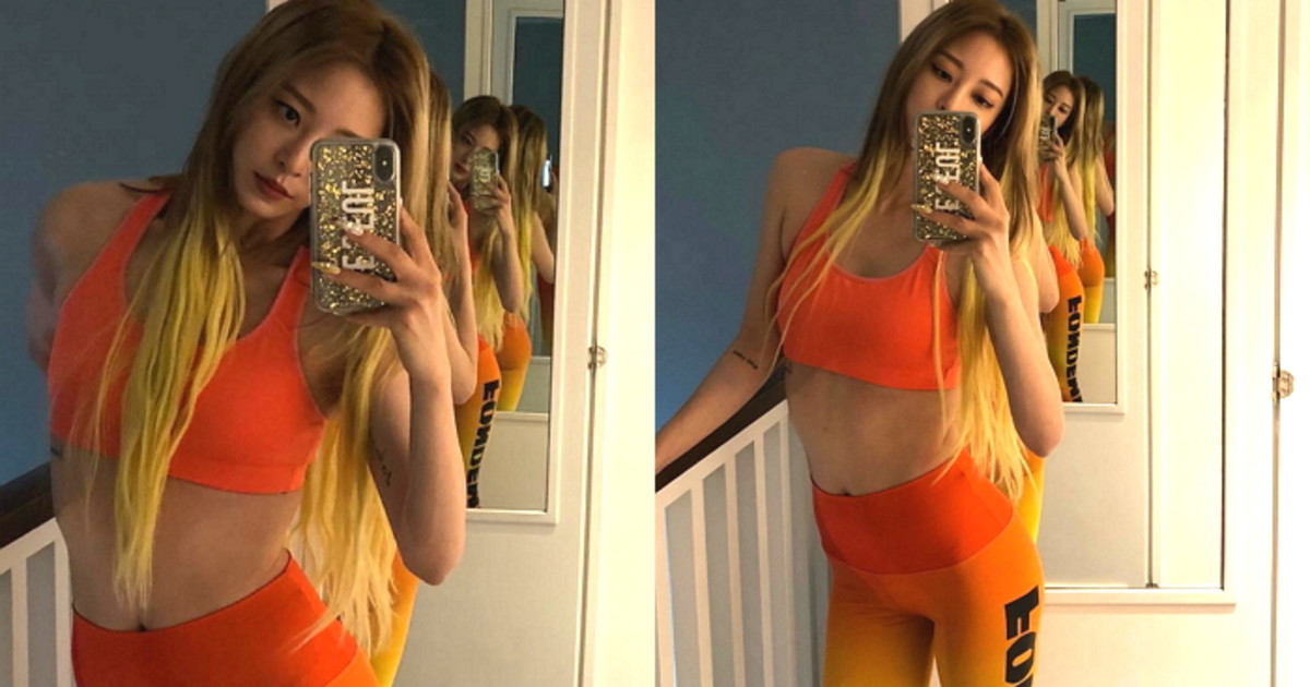 공개된 사진 속 한예슬은 주황빛 레깅스와 크롭 탑 운동복을 입고 있는 모습이다.