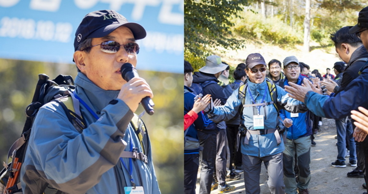 산행 출발하며 임직원들과 하이파이브하는 삼양그룹 김윤 회장 / 사진제공 = 삼양홀딩스