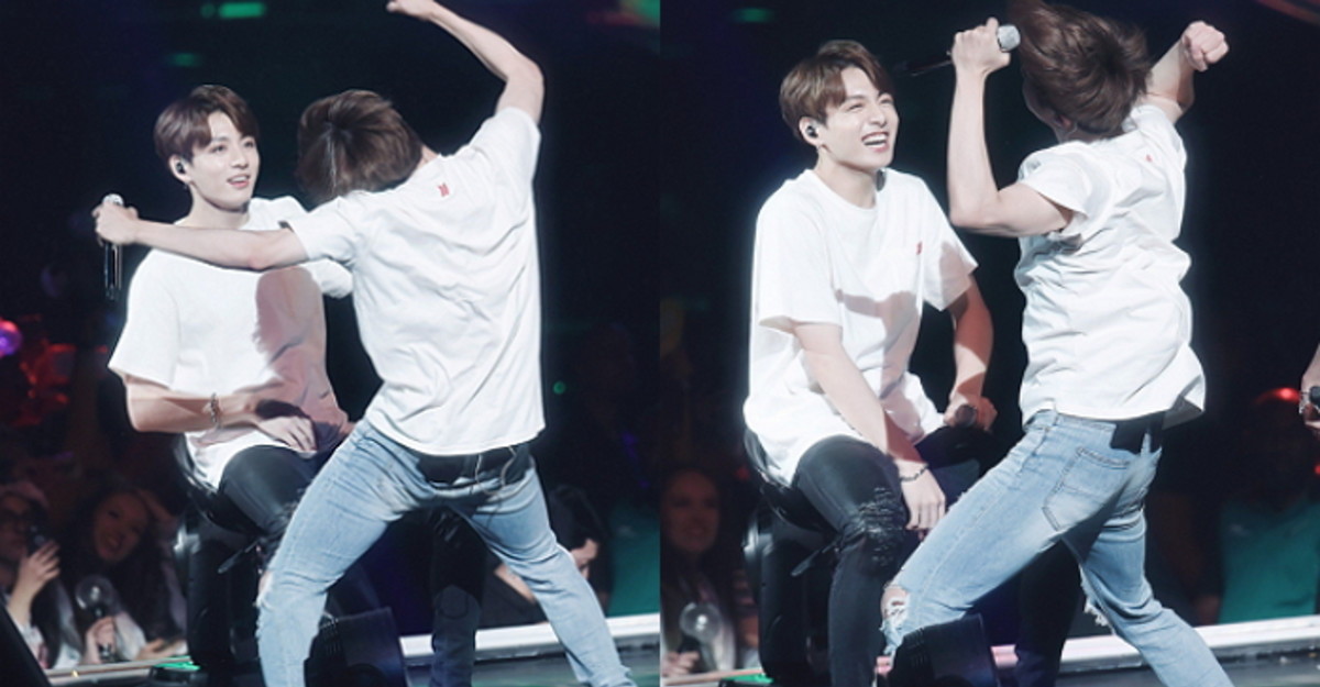 [인사이트] 황비 기자 = 발꿈치 부상으로 앉아서 공연을 해야 하는 막내 정국 앞에서 재롱(?)을 떠는 맏형 진의 모습이 웃음을 자아낸다.