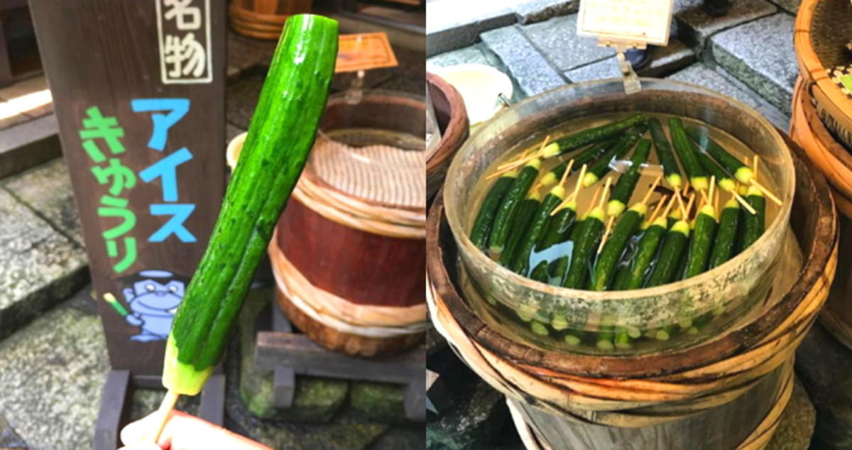 이 음식은 일본 현지에서 '아이스 오이 꼬치'라고 불리는 간식으로 길거리나 시장에서 흔하게 볼 수 있다.