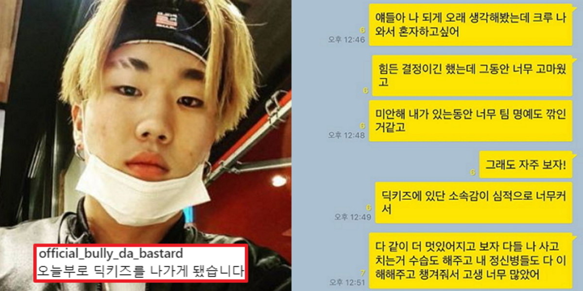 글과 함께 윤병호는 '딕키즈 크루' 멤버들이 속한 단체 카톡 방에서 "크루에 나와 혼자 하고 싶다"며 탈퇴 이야기를 꺼내는 대화가 담긴 캡처본을 공개했다.