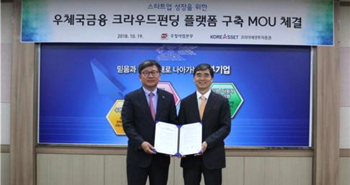 19일 우정사업본부는 코리아에셋투자증권과 스타트업 성장을 위한 크라우드펀딩 플랫폼 구축을 위한 업무협약을 체결했다고 밝혔다.