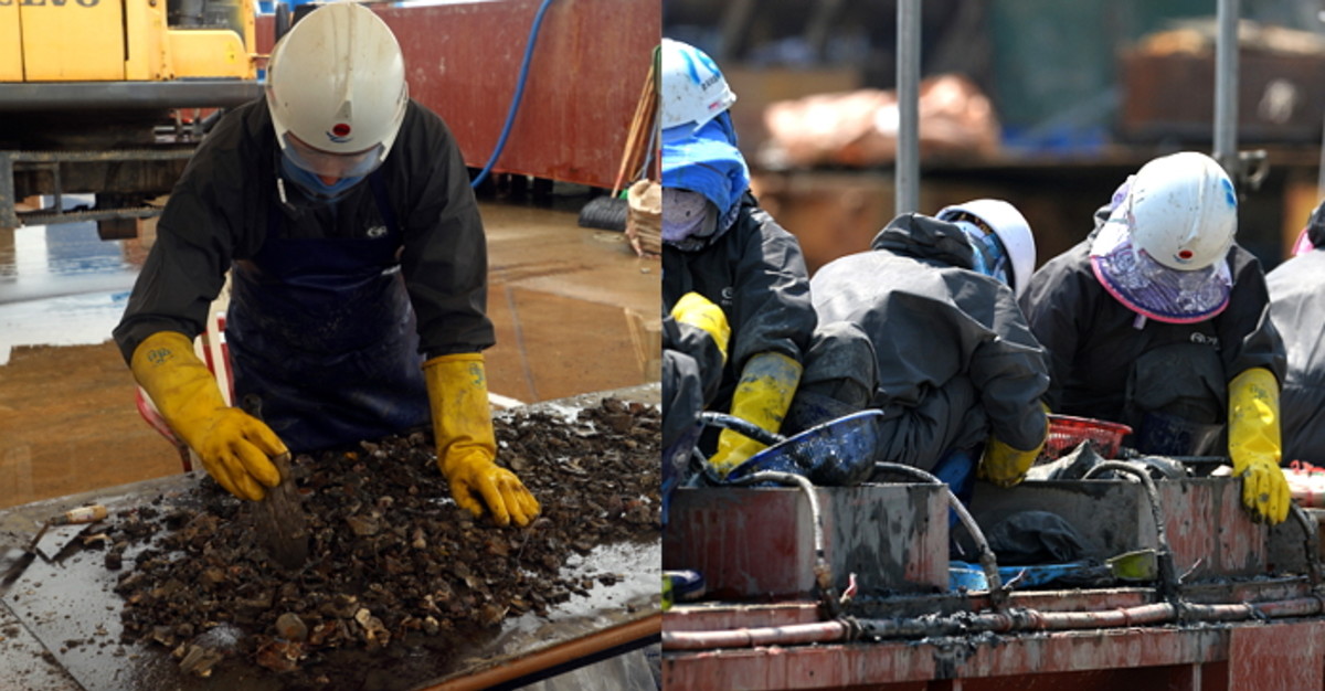 작업자들은 배 안에서 진흙과 뻘 등을 담아 밖으로 가지고 나온다.