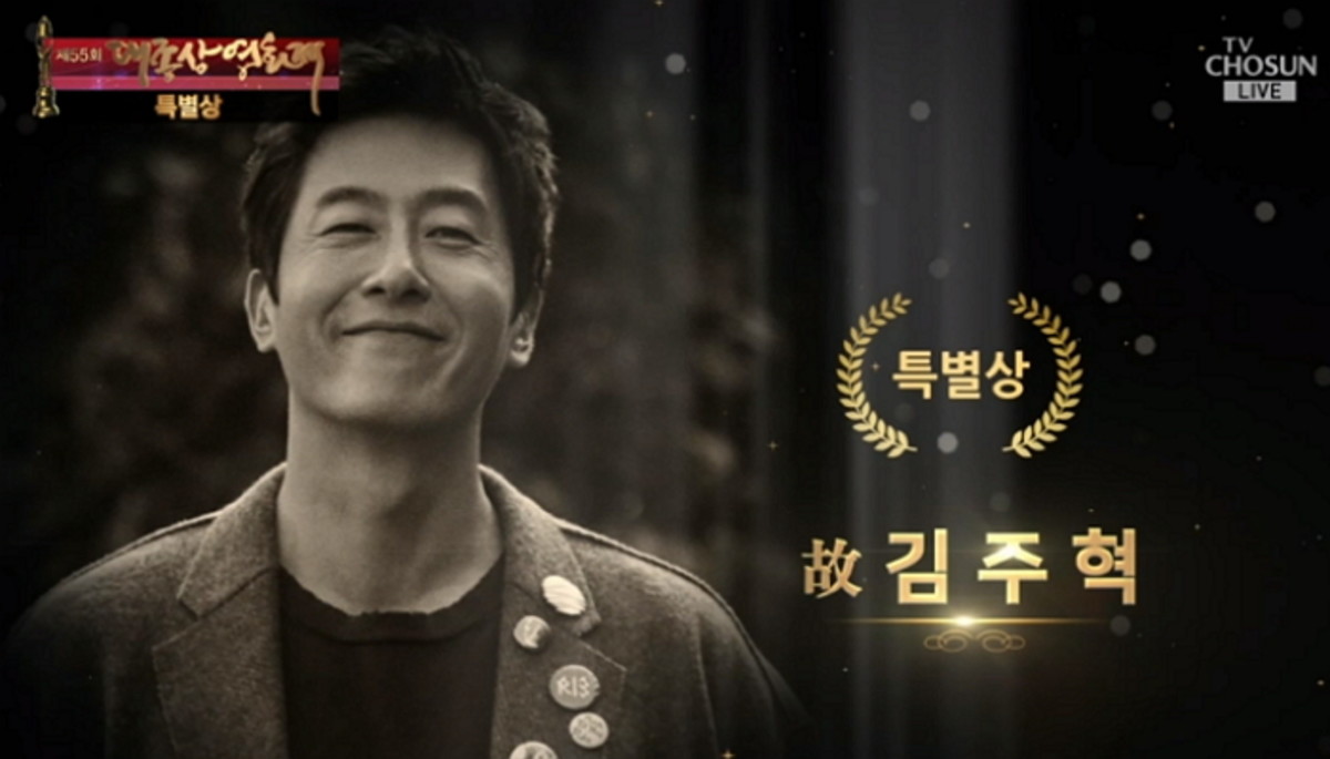 좋은 선후배이자 동료였던 김주혁의 1주기를 맞아 특별한 상이 전달되자 자리에 참석한 여러 배우들도 숙연한 표정을 지었다.
