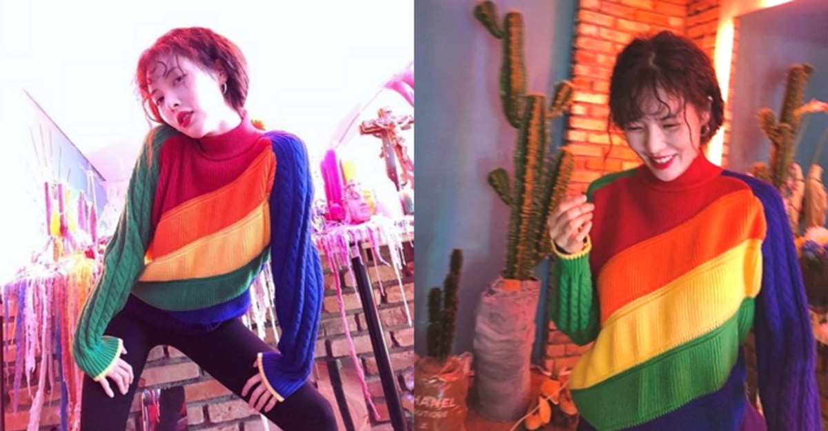 공개된 사진 속 현아는 무지개 색깔의 알록달록한 니트를 입고 사랑스러운 미소를 짓고 있는 모습이다.