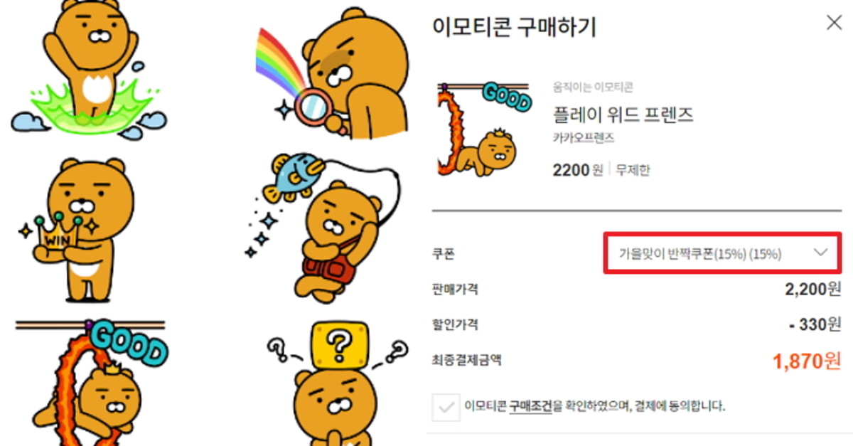 가을 반짝 세일 기간 동안 2,200원인 이모티콘을 1,870원에 구입할 수 있는 셈이다.