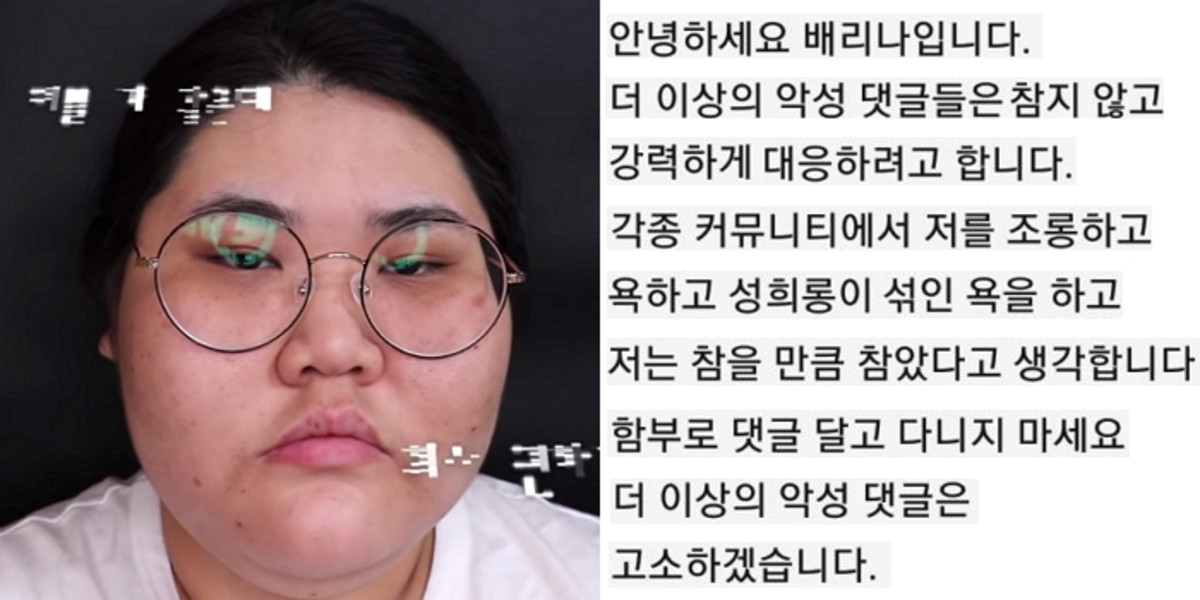 지난 23일 뷰티 유튜버 배리나가 자신에게 악성 댓글을 단 누리꾼들을 고소하겠다고 밝혔다.