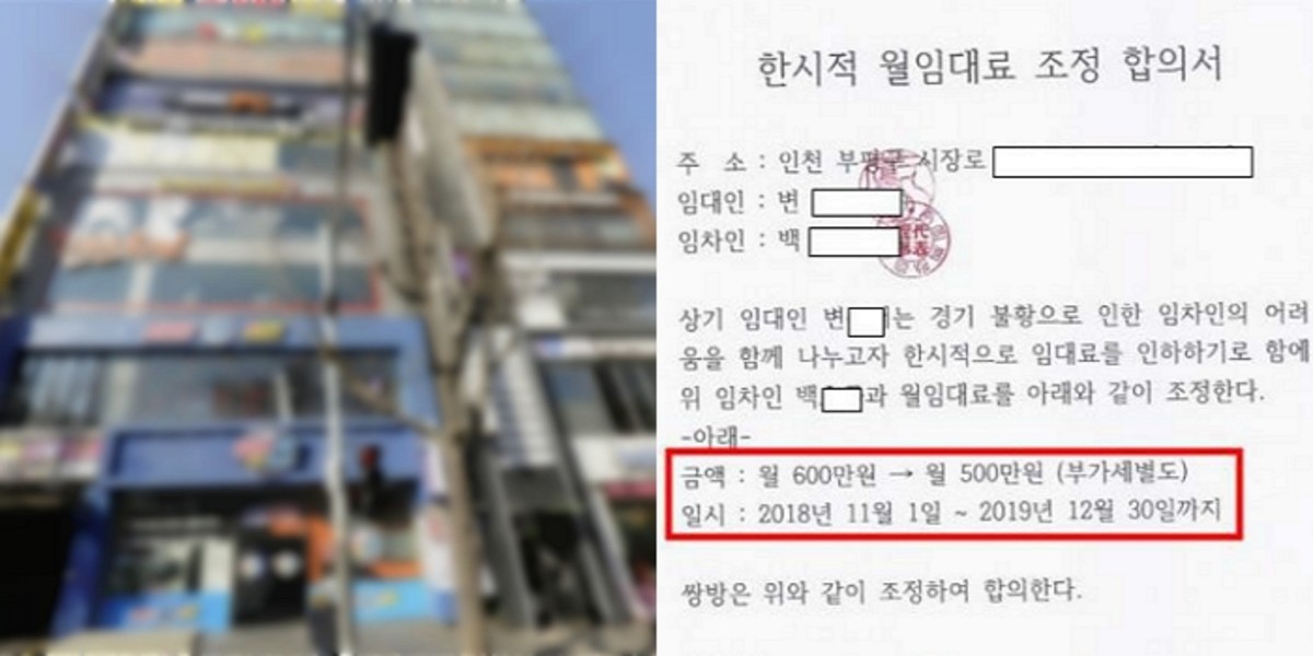 계약서에는 '상기 임대인 OOO은 경기 불황으로 인한 임차인의 어려움을 함께 나누고자 한시적으로 임대료를 인하하기로 함에 위 임차인 A씨와 월 임대료를 아래와 같이 조정한다'는 글과 함께 월 임대료가 '600만원'에서 '500만원'으로 내려가 있었다.