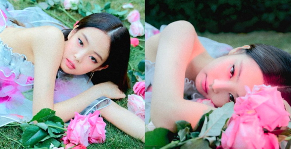 공개된 사진 속 제니는 핑크빛 장미꽃 사이에서 몽환적인 눈빛을 하고 누워있다.