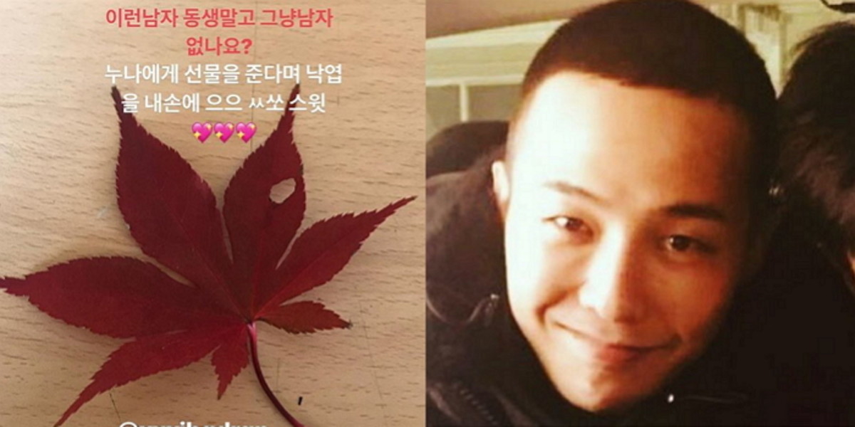 인스타그램 스토리에는 보다 자세한 내용이 담겼는데, 그는 "(지드래곤이) 누나에게 선물을 준다며 낙엽을 내 손에 (쥐여줬다). 쏘 스윗"이라고 전했다.