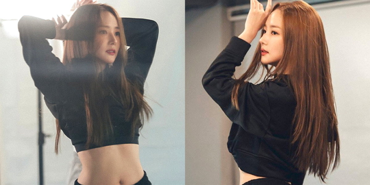 사진 속에서 박민영은 긴 갈색 생머리를 늘어뜨린 채 검은색 크롭 티와 추리닝 바지를 입고 연습에 매진하고 있다.