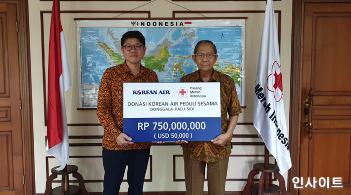 지난 2일 대한항공이 인도네시아 적십자사를 통해 술라웨시 섬 팔루 지역의 지진과 쓰나미 이재민들을 위해 5만 달러의 구호 성금을 전달했다고 밝혔다.
