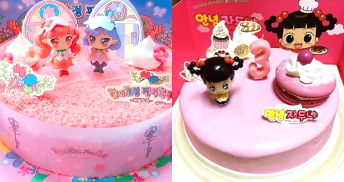 해당 게시물에서 공개된 케이크는 '콩순이', '시크릿쥬쥬', '숲의 요정 페어리루', '안녕 자두야' 등의 분홍 원피스의 여아 캐릭터로 장식된 케이크들이다.