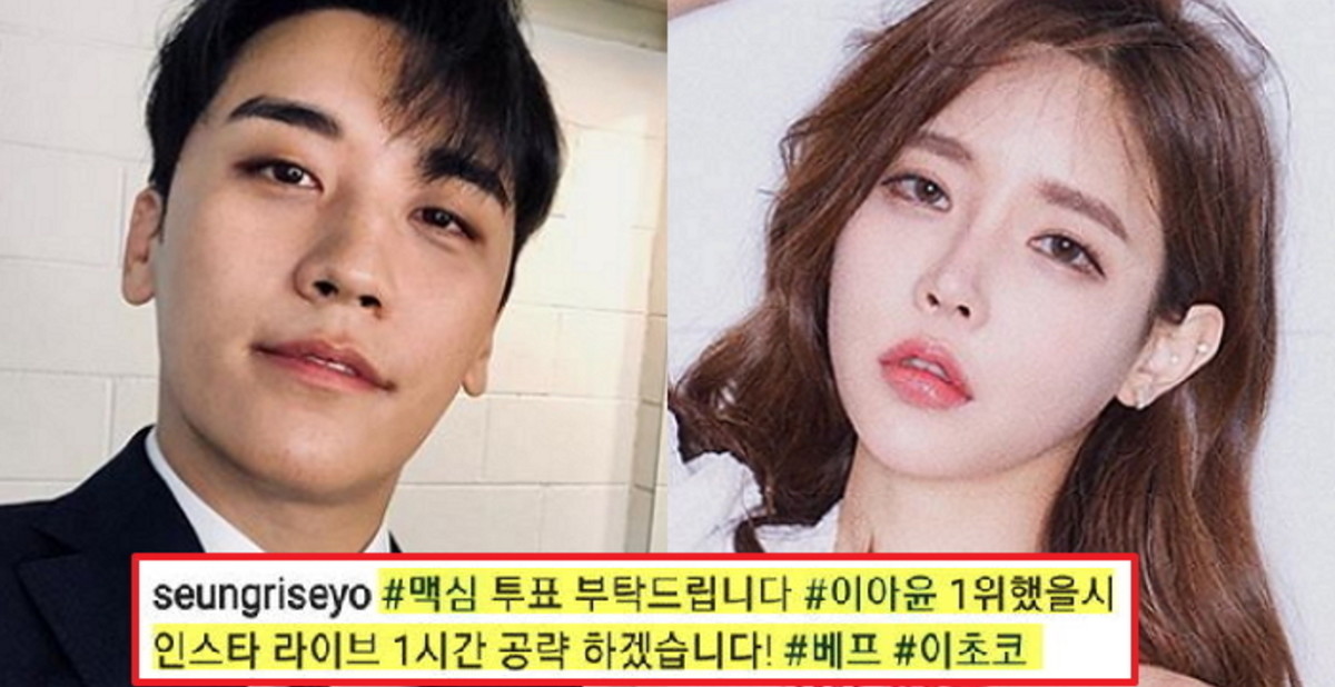 승리가 "맥심 투표 부탁드린다"며 "이아윤 1위 했을 시 인스타 라이브 1시간 하겠다"는 공약을 내걸었기 때문.