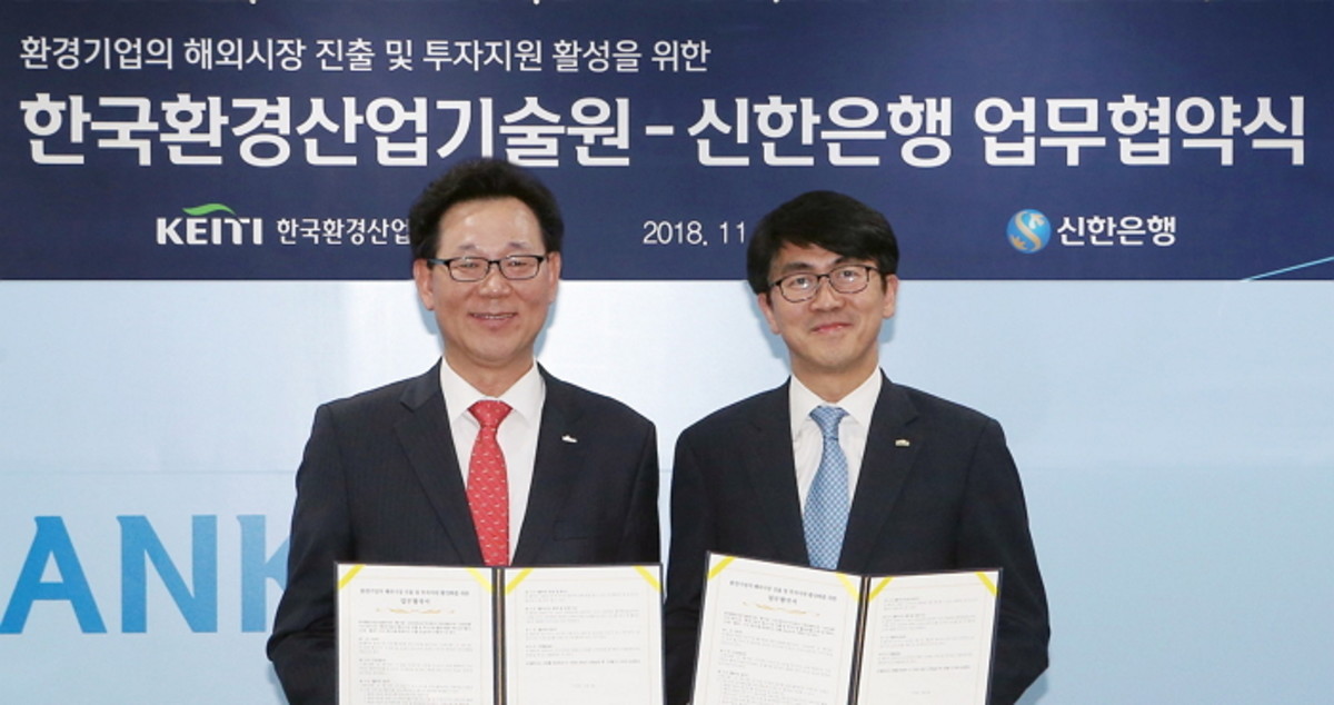 7일 신한은행은 한국환경산업기술원과 서울 중구 소재 신한은행 본점에서 환경기업 해외진출 및 투자지원 활성화를 위한 업무협약을 체결했다고 밝혔다.