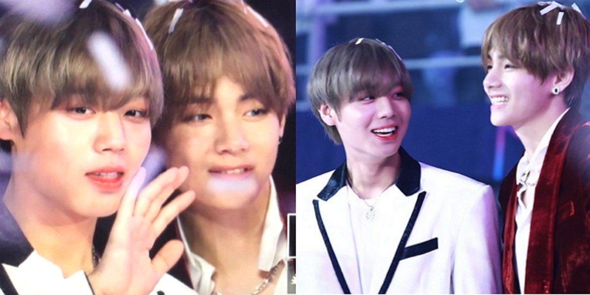 이날 관객석에 앉아 시상식을 함께 즐기고 있던 워너원 멤버 박지훈(20)과 방탄소년단 뷔(24)는 나란히 서서 이야기를 나눴다.