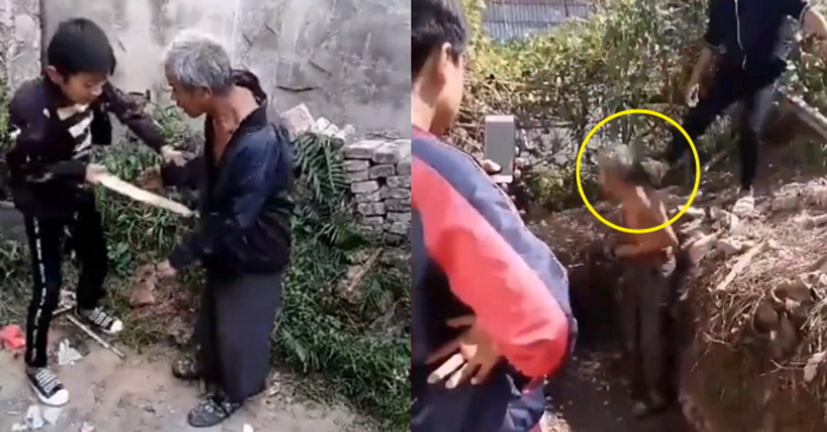 영상이 촬영된 곳은 중국 광서성 계림시로, 당시 5명의 소년들은 머리가 희끗희끗한 노인을 배수로에 거칠게 밀어 넣었다.