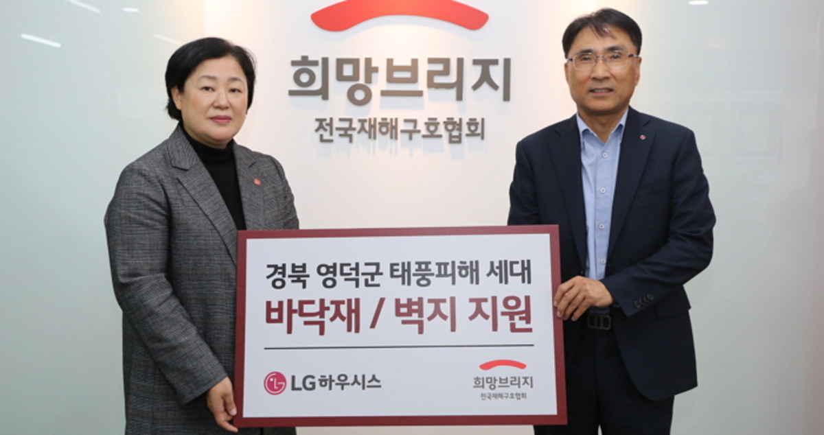 7일 LG하우시스는 서울 마포구 희망브리지 전국재해구호협회에서 경북 영덕군의 태풍 피해 복구를 위한 기부 물품 전달식을 가졌다고 밝혔다.