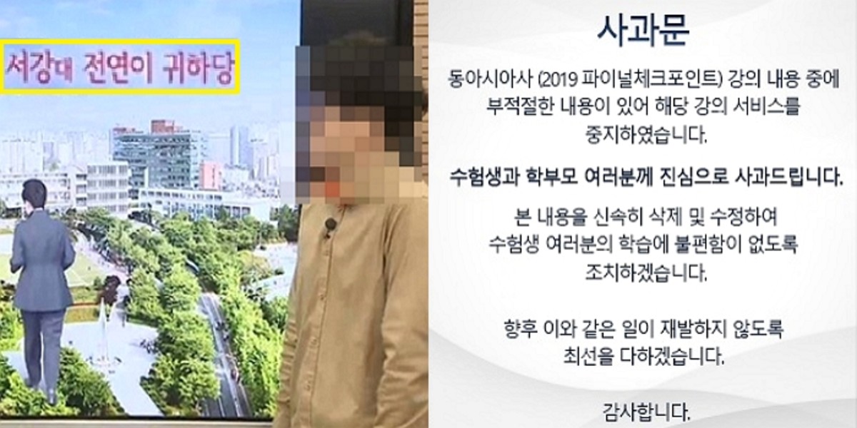 사과문에는 "동아시아사 강의 내용 중에 부적절한 내용이 있어 해당 강의 서비스를 중지했다"며 "수험생과 학부모 여러분께 진심으로 사과드린다. 향후 이와 같은 일이 재발하지 않도록 최선을 다하겠다"는 내용이 담겼다.