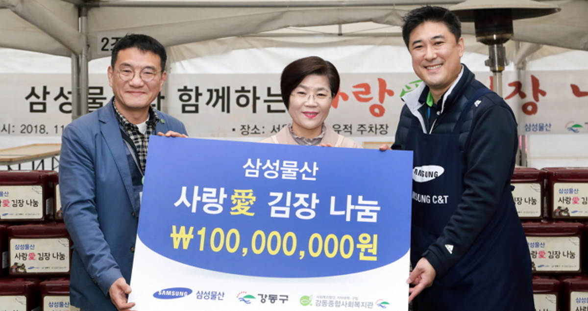 9일 삼성물산 건설부문은 서울시 강동구 암사동 선사유적지 주차장에서 강동구 자원봉사센터, 강동종합사회복지관과 함께 '사랑愛 김장나눔' 봉사활동을 진행했다고 밝혔다.