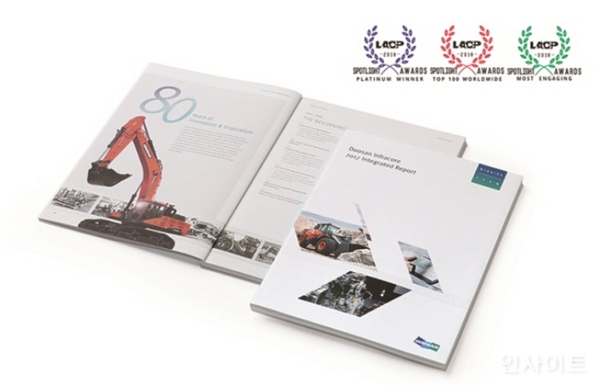 [인사이트] 이하린 기자 = 두산인프라코어는 지난 6월 발간한 2017 통합보고서가 미국 '2018 스포트라이트 어워드'(Spotlight Awards)에서 통합보고서 부문 최고 등급인 플래티넘을 수상했다고 9일 밝혔다.